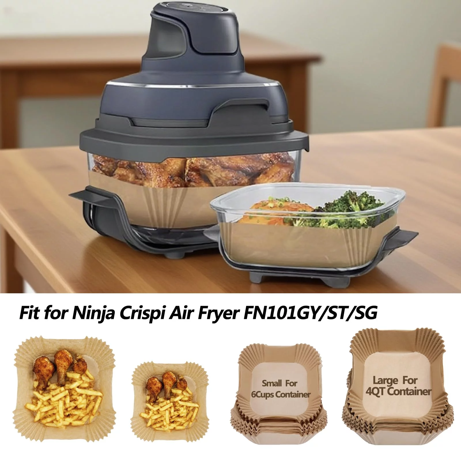 - Perfect Fit Ninja Crispi Air Fryer:: Compatible with Ninja Crispi FN101GY/FN101SG/FN101ST.No need to bend or twist.Including 270PCS air fryer parchment paper liners,135PCS large for 4QT Ninja Crispi containers,135PCS small for 6CUPS containers.