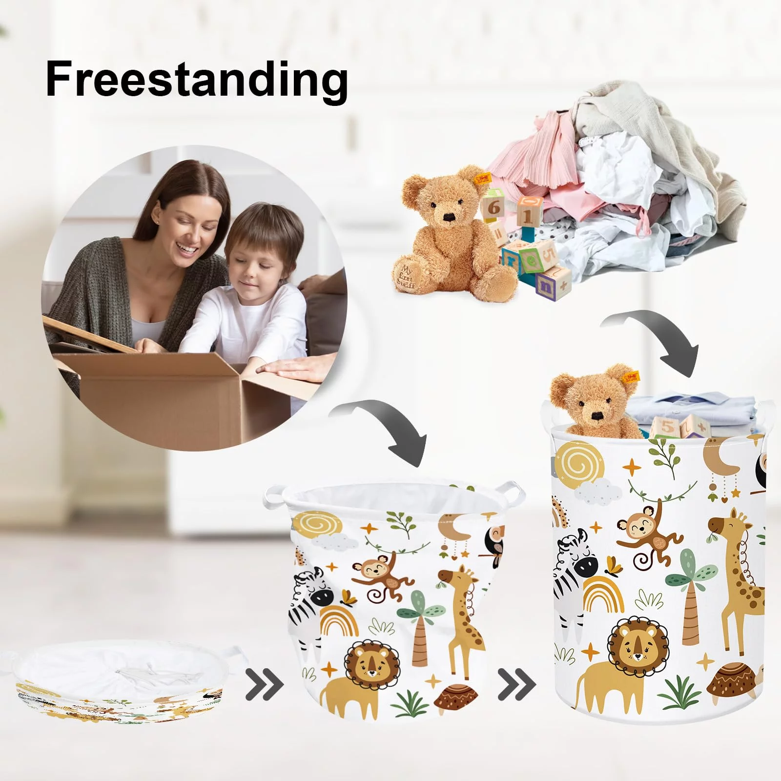 - Brown Animal Baby Nursery Hamper - Adorable giraffe, monkey, lion, zebra playing together, it showcases the friendly interaction between animals and children and motivates them to interact with animals
