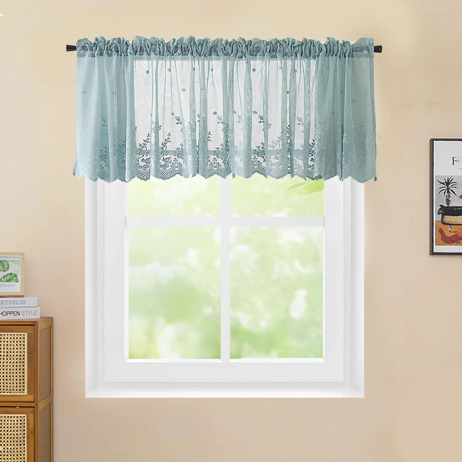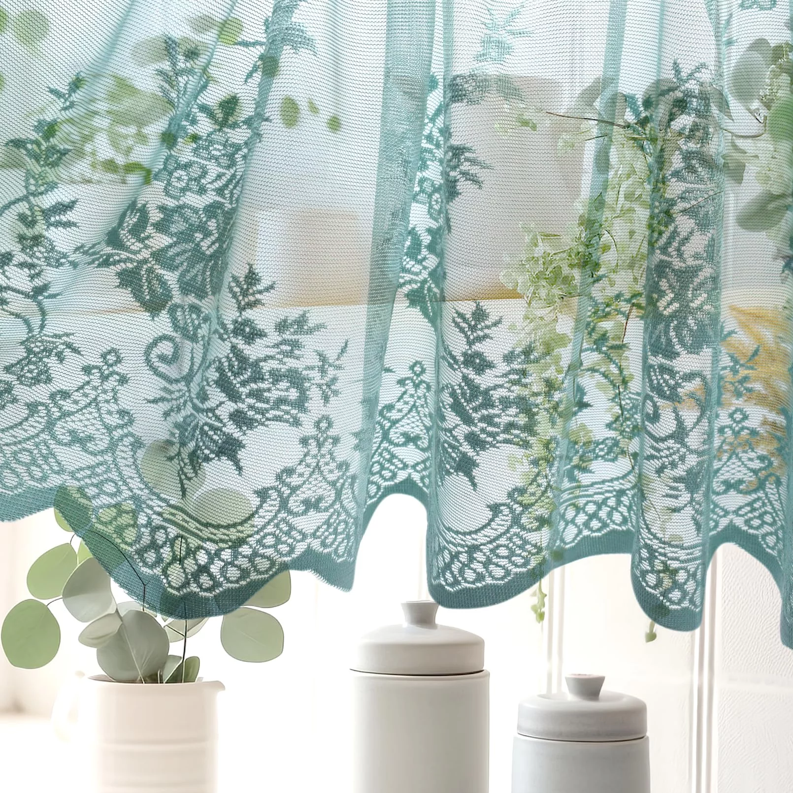 - Material: 100% Polyester MINE GREEN,similar with color blue from pictures,white soft,resistant,breathable,no fading,and healthy for your home decor. Semi sheer embroideried pattern knitted Lace kitchen valance with beautiful scalloped bottom, matching morden home decor curtains