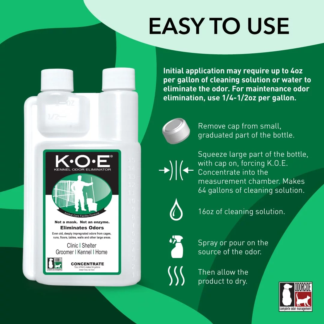 - Easy to Use: Dilute KOE 4-8oz per gallon of water/cleaning solution for one time odor elimination or 1/4-1/2oz per gallon of water/cleaning solution for maintenance odor elimination. KOE must reach the source of the odor to eliminate the odor 100%. Saturate the area heavily so that KOE can reach the full source of the odor and let air dry. May be applied with a pump-up sprayer. If the odor persists, either the full source of the odor wasnt reached, or a stronger dilution ratio is needed.