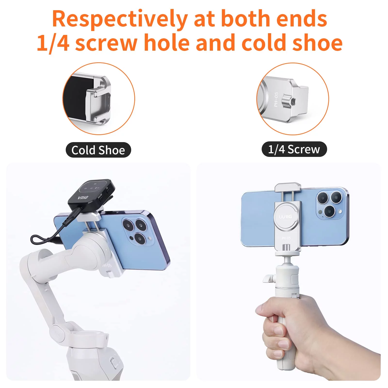 - ?Cold Shoe and 1/4" Screw Design?Cell phone tripod mount with one standard 1/4" screw hole and cold shoe mounts. 1/4" screw holes can be used to install accessories such as tripods, selfie sticks, stabilizers, etc. Cold shoe mounts can fix microphones, video lights and other equipment